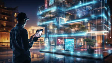 Architect reviews skyscraper hologram with thermal data and progress report on tablet. Clear deta...
