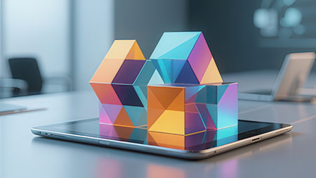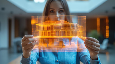 A person holds a tablet displaying a 3D model of a house, showcasing augmented reality. The digital design is overlaid onto the real-world view, highlighting architectural details. The lighting suggests indoor use, emphasizing technological advancements. Suitable for illustrating real estate, design, and innovation concepts.