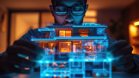 An architects workspace features a holographic house model surrounded by digital designs and data screens. The setting is illuminated by evening light, enhancing creativity.