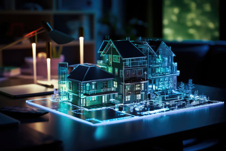 A futuristic architectural model of modern house with glowing holographic design elements.