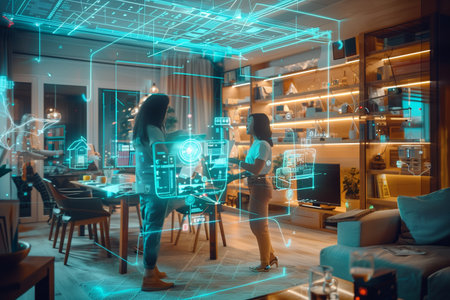 People in futuristic living room with holographic smart Technology of home entertainment for a Luxurious Lifestyle. Showcasing interconnected devices.