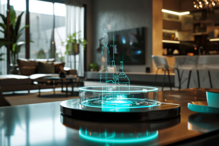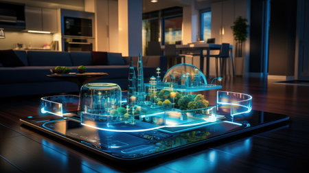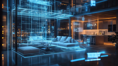 Hologram of a smart home illuminating a dark room, showcasing futuristic living and modern technology