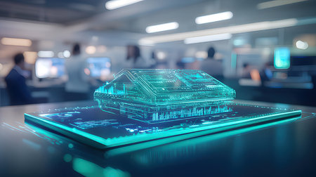 A striking holographic 3D building model presents a blend of futuristic design and advanced technology in a modern office setting.