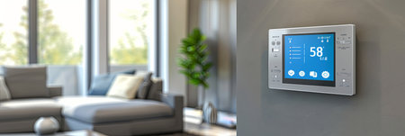 Thermostat smart home domotic control panel on wall for winter house temperature banner panoramic. Energy saving hand touching to adjust temperature of heating in living room.