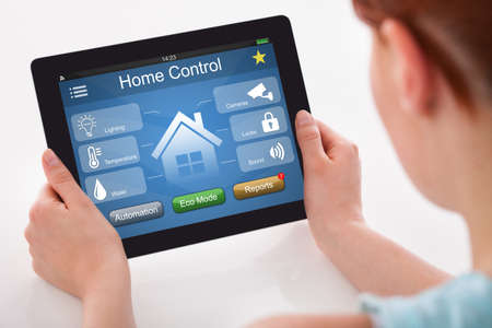 Intelligent home concept. Young woman using smart home application on a tablet