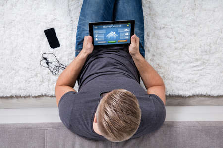 Close-up Of A Man Sitting On Carpet Watching Home Control System On Digital Tablet Screen