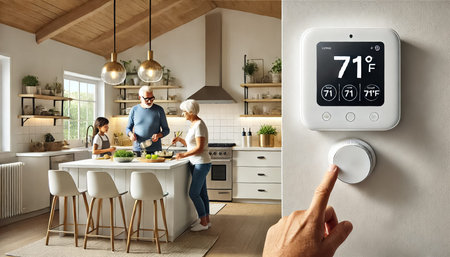 A hand touches a smart home interface displaying current and target temperatures, vacation mode,...