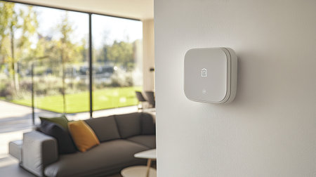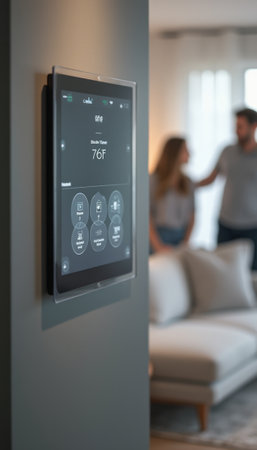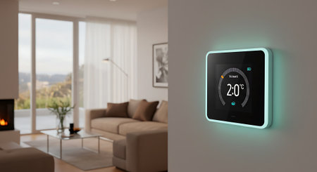 A stylish smart thermostat shows 31 degrees in a well-lit living room adorned with comfortable furniture.