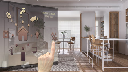 Smart home control concept, hand controlling digital interface from mobile app. Background showing modern living room and kitchen, architecture interior design