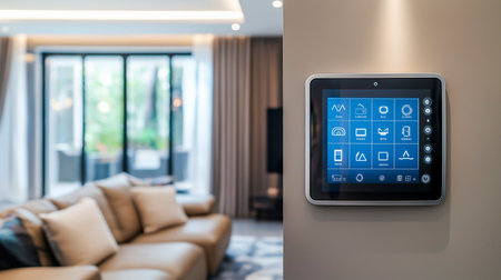 Smart home automation system in modern living room interior. Smart home control panel.