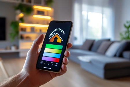 Smartphone with energy performance label and gas chart in a stylish living room for green tech