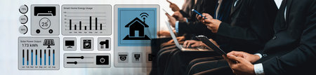 Business professionals engage with smart home energy data and analytics, highlighting the intersection of technology and sustainability in modern lifestyle choices. Gantry