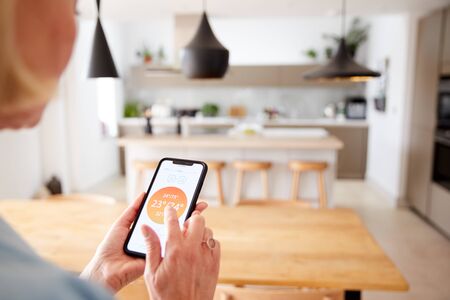 Close Up Of Woman Using App On Smart Phone To Control Central Heating Temperature In House