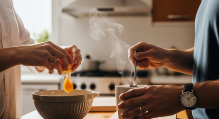 Woman hands cracking an egg into a bowl while a man stirs a steaming hot drink in a mug, preparing breakfast together in a modern kitchen.