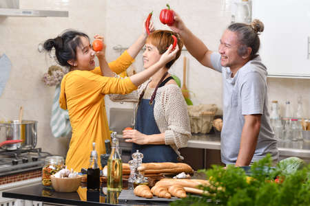 Happy family of mother father and daughter cooking in kitchen making healthy food together feeling fun and making funny faces
