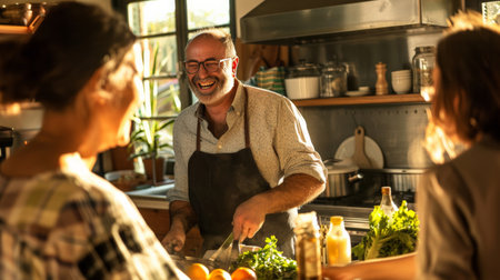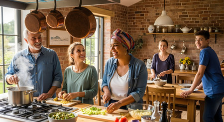 A family gathered in the kitchen, laughing and cooking together, the room filled with the warmth of shared stories and the aroma of a homemade meal.