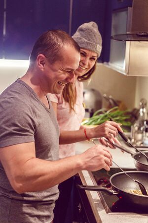 Couple cooking together in the kitchen at home. Man and woman cooking together