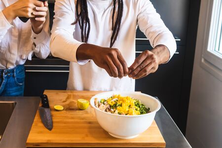 Stock photo of black guy putting lemon to a salad while a girl records it with the mobile in the kitchen