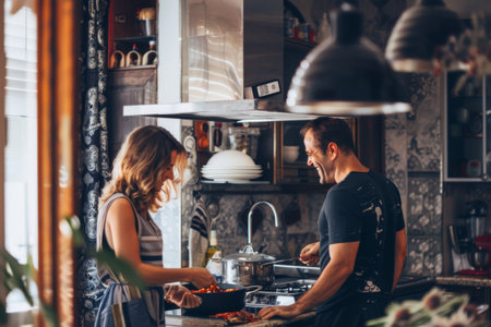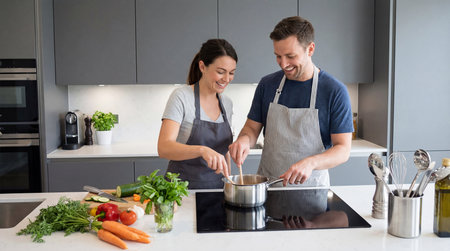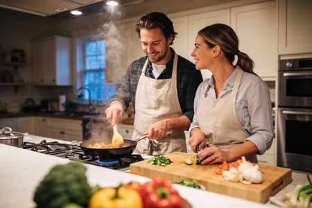 A cheerful couple enjoys cooking together in a stylish kitchen, fostering warmth and connection. Their laughter and enthusiasm create a vibrant cooking atmosphere.