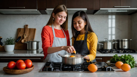 Two friends preparing a healthy dish together in a modern kitchen during a sunny afternoon