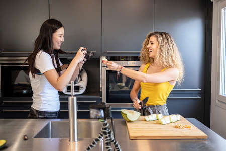 asiatic woman filming caucasian woman cutting fruit in a kitchen
