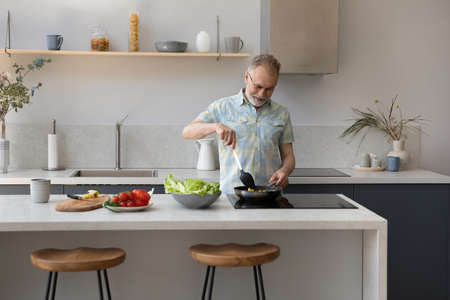 Mature 60s homeowner man cooking dinner in kitchen, stirring meal in frying pan at table with fresh vegetables, bowls, salad ingredients, enjoying culinary hobby. Healthy eating, homemade food concept