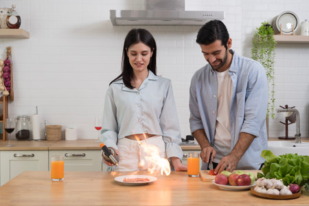 Young couple preparing food together in modern kitchen, woman using cooking torch on meal while man slicing vegetables, symbolizing love, lifestyle, healthy eating, teamwork, home cooking happiness.