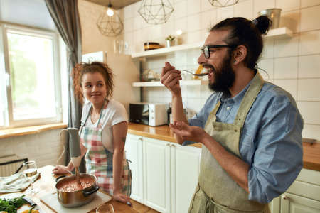Italian man, chef cook tasting soup while his girlfriend looking at him. Cheerful couple preparing a meal together in the kitchen. Cooking at home, Italian cuisine