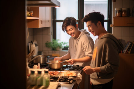 Generative AI : Candid of young attractive asian men couple in kitchen or indoor hugging with love together sitting at table with computer and snack Gay homosexual lifestyle at hom