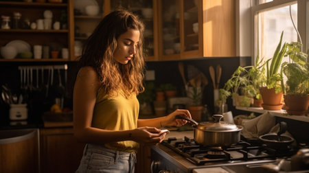 A cozy home kitchen setting with a pot of homemade simmering on the stove, surrounded by fresh ingredients and spices
