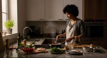 A woman with an apron cooks in a modern, dimly lit kitchen, stirring food in a steaming pan on an induction stovetop. Ingredients like fish, chicken, tomatoes, and herbs are laid out on the counter next to a glass of red wine.