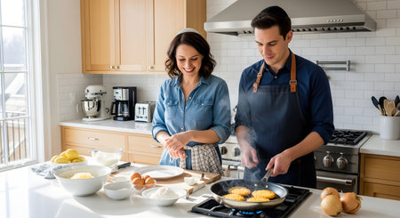 A happy Jewish couple cooks together in a modern, bright kitchen. The man wears an apron and fries latkes (potato pancakes) in a pan, while the woman, wearing a kippah, smiles and assists.