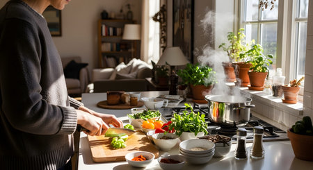 A person stands at a kitchen counter chopping green vegetables on a wooden board. A stainless steel pot steams on the stove nearby, and sunlight filters through the window, highlighting the fresh ingredients and cooking process.