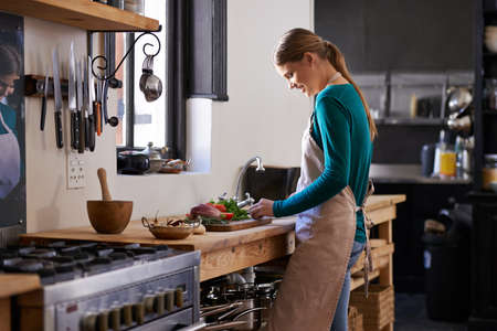 Shes a pro in the kitchen. Shot of a young woman chopping vegetables at a kitchen counter.