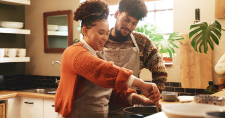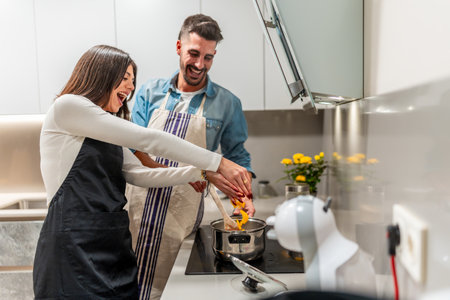 Happy couple wearing aprons preparing food in modern kitchen, stirring in pot and laughing