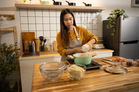 Young woman wearing apron adding water to a pot, getting ready to cook noodles.