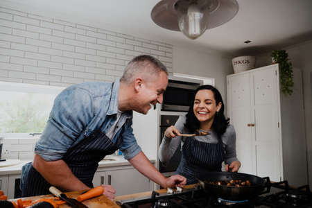 A husband and wife laughing together while cooking a meal in their kitchen.. --ar 3:2 Job ID: 6b6a7ba4-cd88-436f-b531-e96da7783710