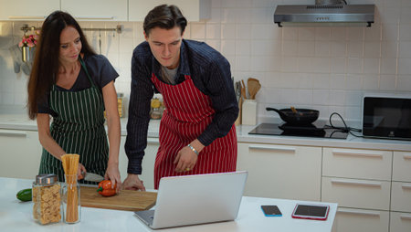 White Caucasian couples or lovers are learning to cook online with laptop or notebook at the modern kitchen.