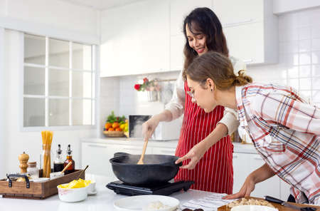 Happy asian couple cooking together in the kitchen at home. Asian people