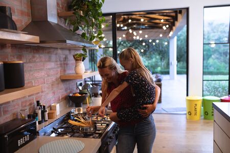 Caucasian woman enjoying her time at home, standing by a table, holding her daughter up, cooking pasta together, social distancing and self isolation in quarantine lockdown during coronavirus covid19 epidemic