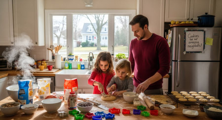 A father and his two young daughters enjoy a heartwarming baking session in a bright, sunlit kitchen. They are making homemade cookies, surrounded by ingredients and colorful cookie cutters, celebrati