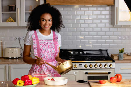 Home, woman and chef in kitchen for cooking, culinary skills and ingredients on counter for dinner. House, happy person and cook with experience for food recipe, breakfast and meal prep on stove