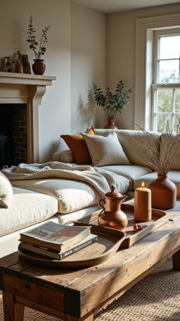 A cozy modern living room with warm lighting, featuring a coffee table with books, decorative items, and autumn leaves, surrounded by comfortable sofas and a stylish lamp
