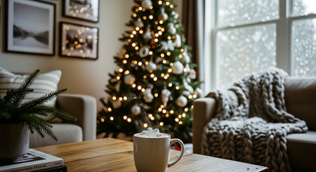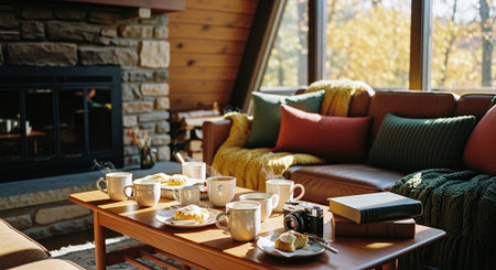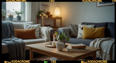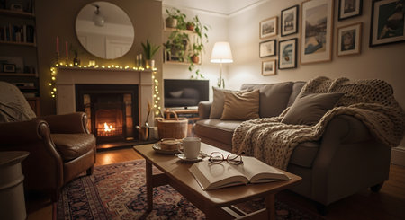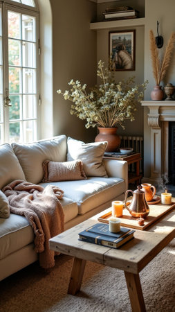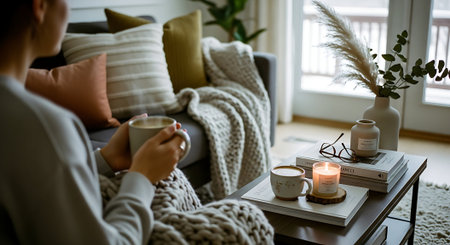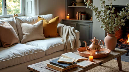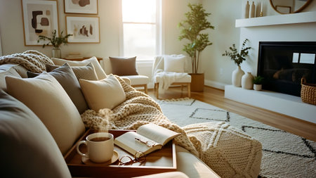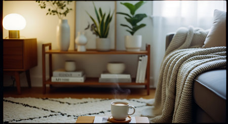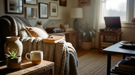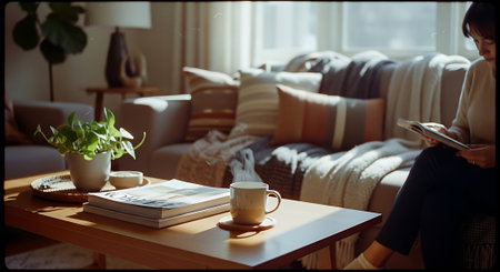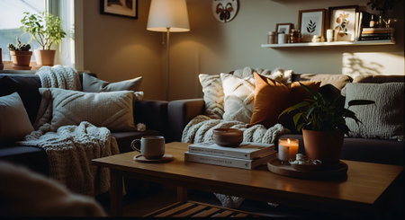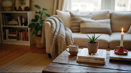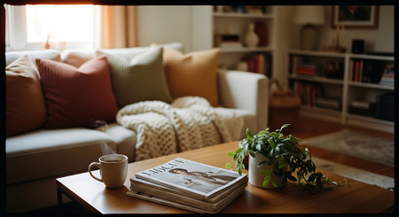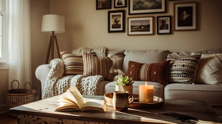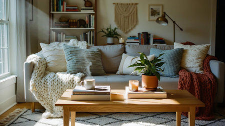 A warm, inviting living room with a coffee table featuring a mug, glasses, books, and a plant. A comfortable sofa with pillows and a cozy blanket is visible.