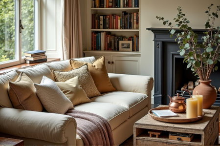 Cozy living room with beige sofa, bookshelves, and elegant decor. That the image is generated using AI.
