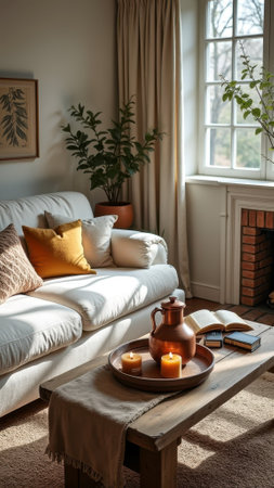 A serene living room with a white couch, wooden coffee table, and natural textures, featuring a plant, book, and coffee cup, with warm sunlight streaming through the window.