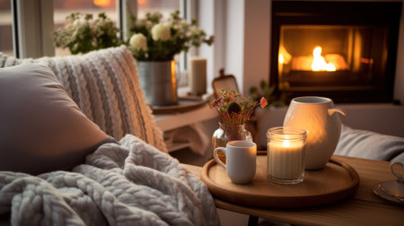Cozy living room interior with fireplace, cozy sofa and knitted plaid