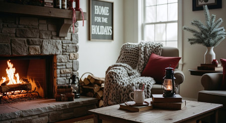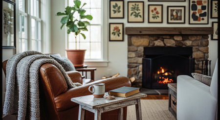 A warm and inviting living room scene featuring a wooden table with coffee cups, books, and a plant, set against a cozy fireplace and comfortable seating area.