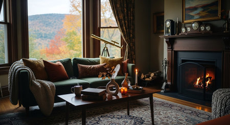 Interior of a living room with a fireplace and a sofa in autumn