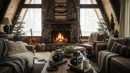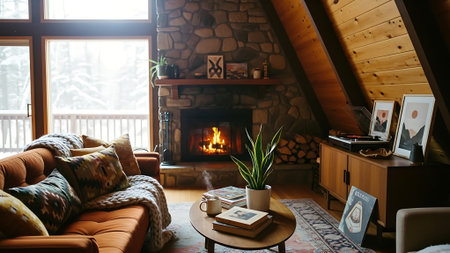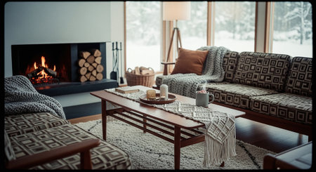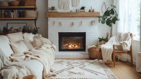 Cozy Scandinavian-inspired living area features a warm fireplace, natural decor elements, and comfortable seating. Soft textiles and greenery create a welcoming ambiance for relaxation.